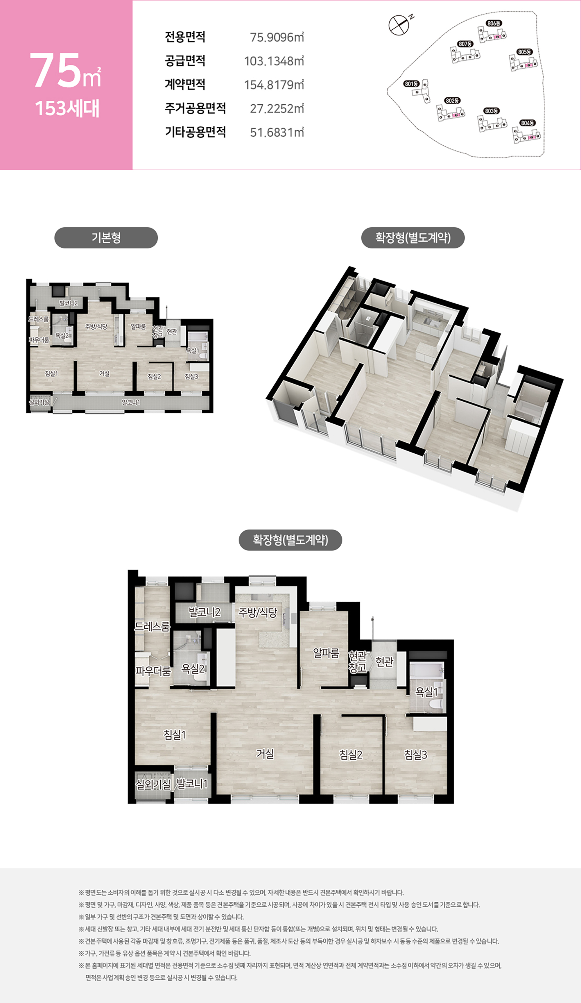 59㎡ 슬라이딩 도어(유상옵션), 75㎡ 알파룸 등 더 넓은 공간 활용이 가능한 특화설계