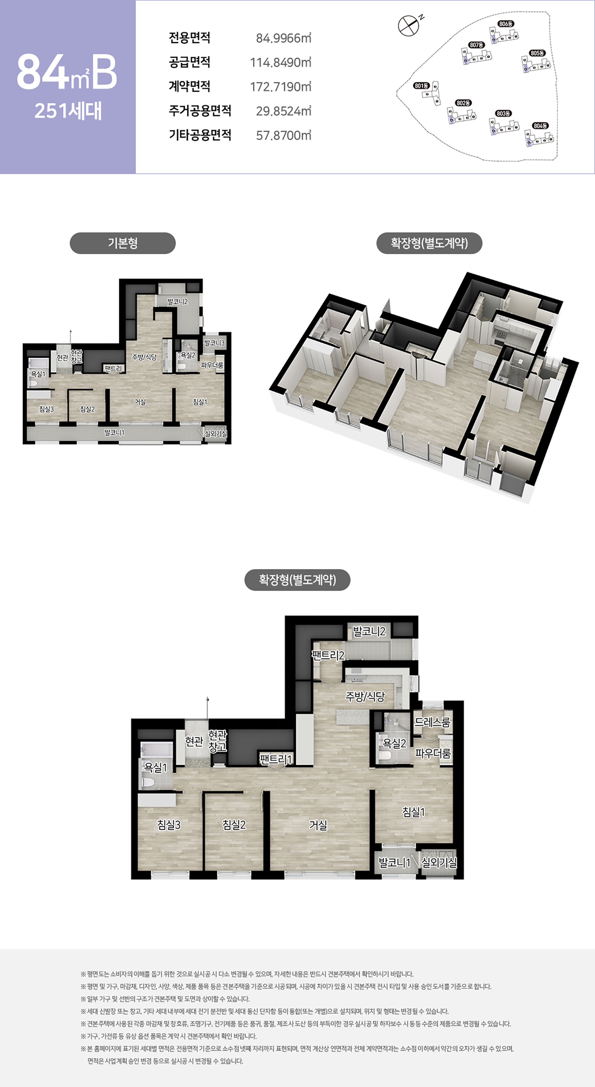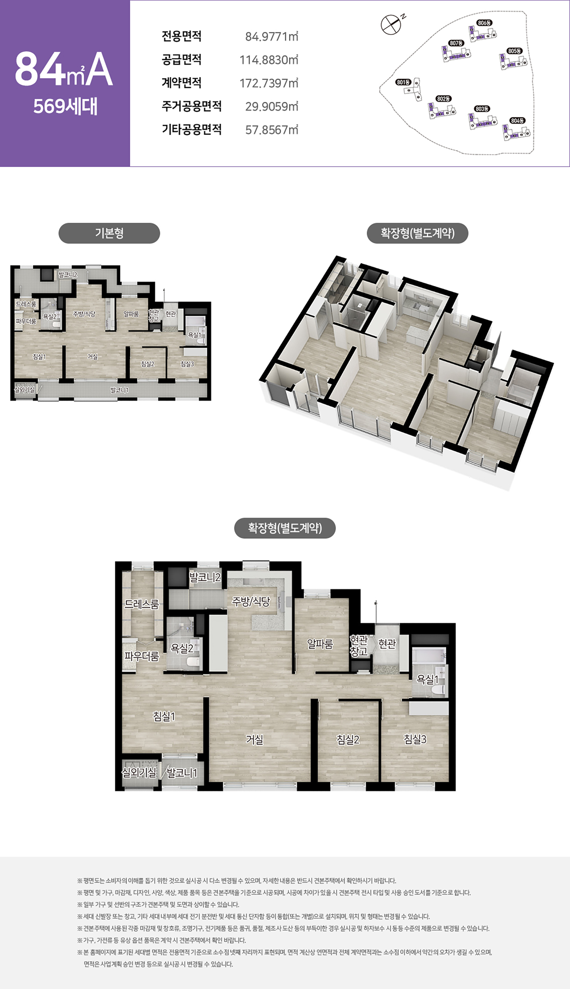 84㎡A·B 4Bay 구조,알파룸과 팬트리 공간 등 다양한 수납공간과 개방감 확보