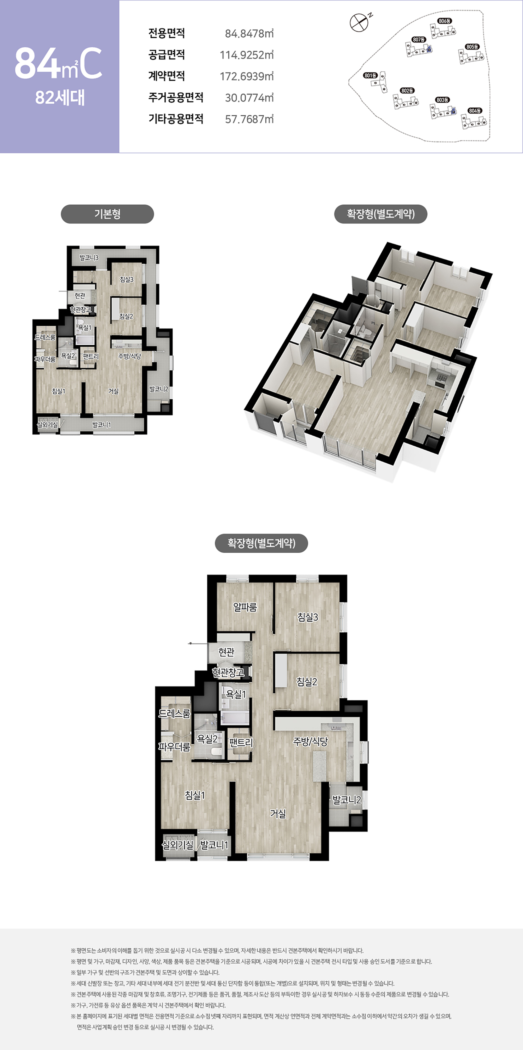 84㎡C 세대 생활권 구분이 가능한 복도식 구조와 알파룸 등 다양한 공간활용 가능